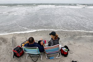 George Barats, of Levittown, Pa., and Michele Scheid, of Bristol, Pa., sit on the edge of a churning Atlantic Ocean Saturday, Oct. 27, 2012, in North Wildwood, N.J., as Hurricane Sandy begins to show its effects. From the lowest lying areas of the Jersey shore, where residents were already being encouraged to leave, to the state’s northern highlands, where sandbags were being filled and cars moved into parking lots on high ground, New Jersey began preparing in earnest for Hurricane Sandy. (AP Photo/Mel Evans)