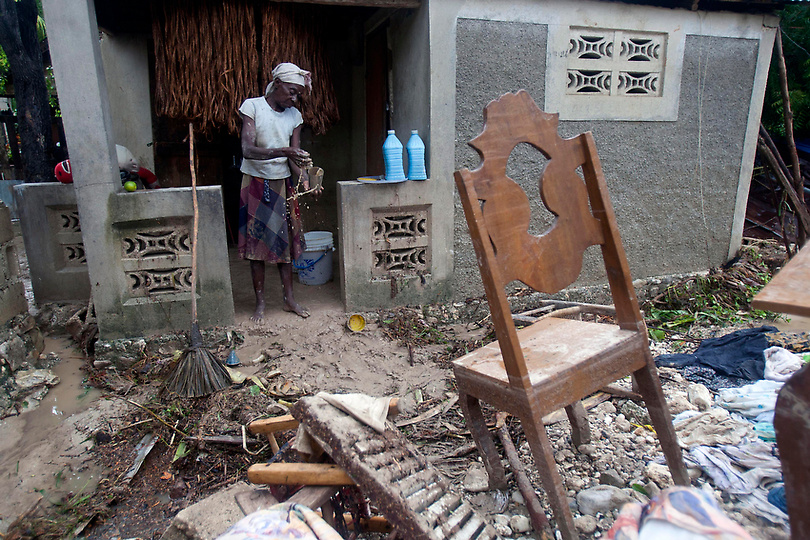 A woman cleans her home, drenched by the heavy rains from Hurricane Sandy in Gran Goave, Haiti, Friday, Oct. 26, 2012. The hurricane raged through the Bahamas early Friday after leaving 38 people dead across the Caribbean. The death toll was still rising in Haiti, reaching 25 on Friday as word of disasters reached officials and rains continued to fall. (AP Photo/Dieu Nalio Chery)