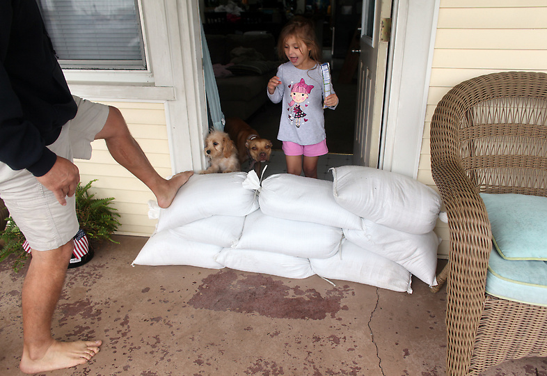 Hannah Smith, 4, looks over a pile of sandbags as her dad, Charles, checks their stability in front of their home along Ocean View Avenue Saturday, Oct. 27, 2012 in Norfolk, Va. Hurricane Sandy, upgraded again Saturday just hours after forecasters said it had weakened to a tropical storm, was barreling north from the Caribbean and was expected to make landfall early Tuesday near the Delaware coast, then hit two winter weather systems as it moves inland, creating a hybrid monster storm. (AP Photo/The Virginian-Pilot, Ross Taylor) MAGS OUT